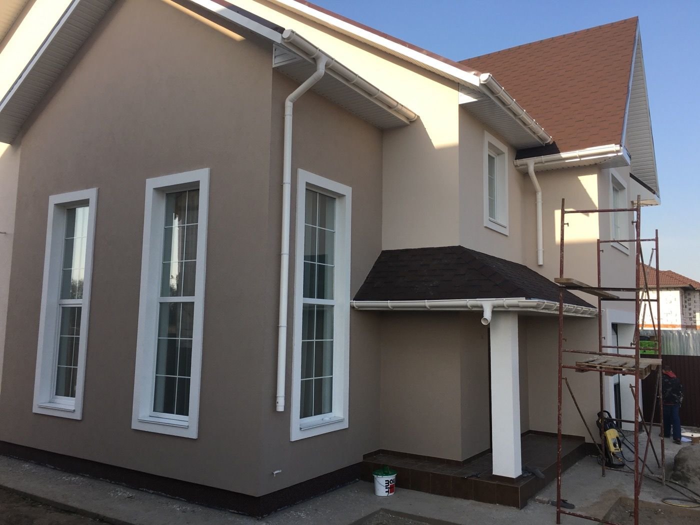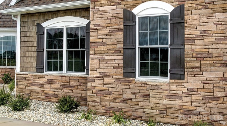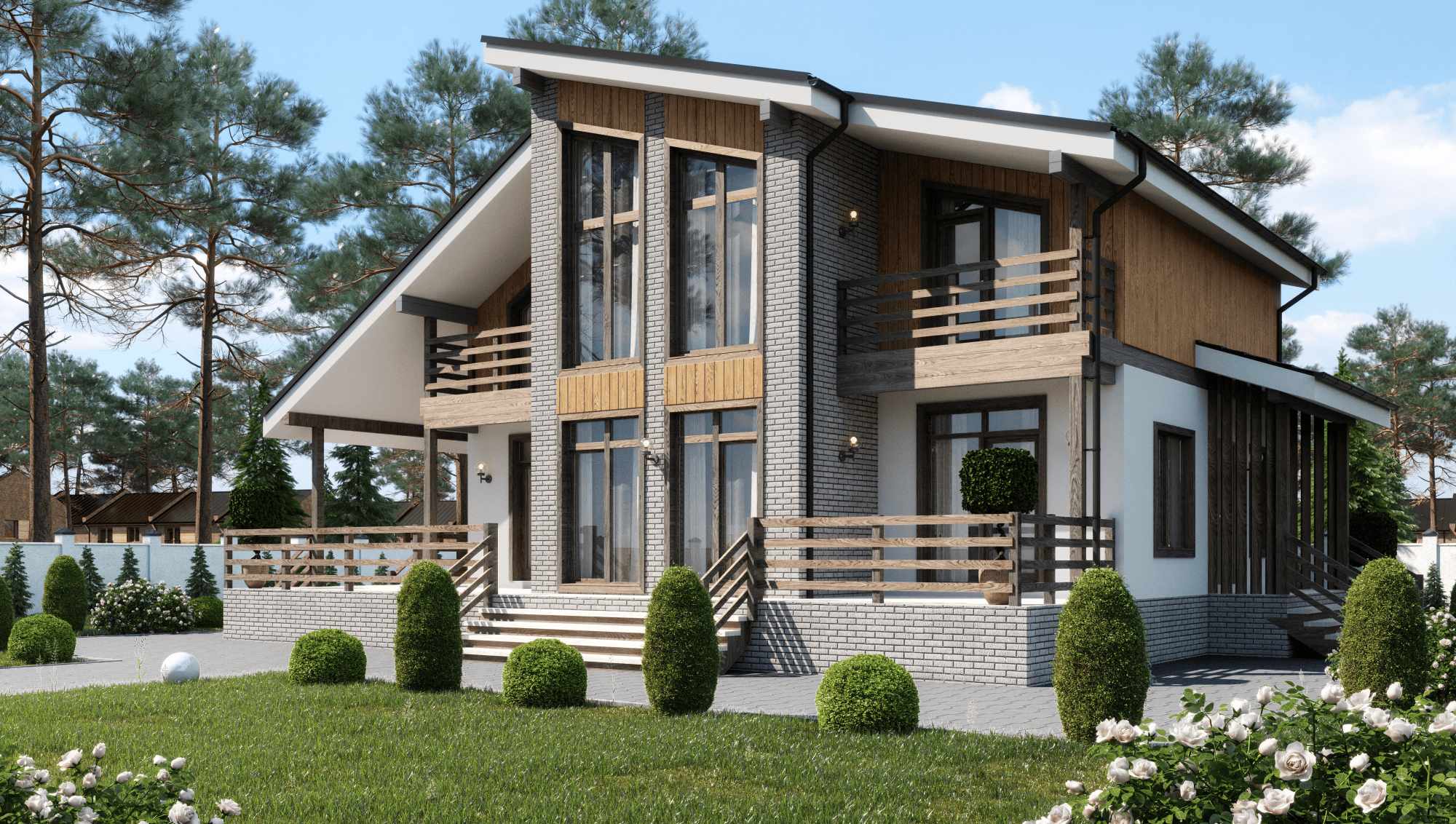 Отделка комбинированная из штукатурки, дерева и фиброцементных панелей, имитирующий кирпичную кладку.