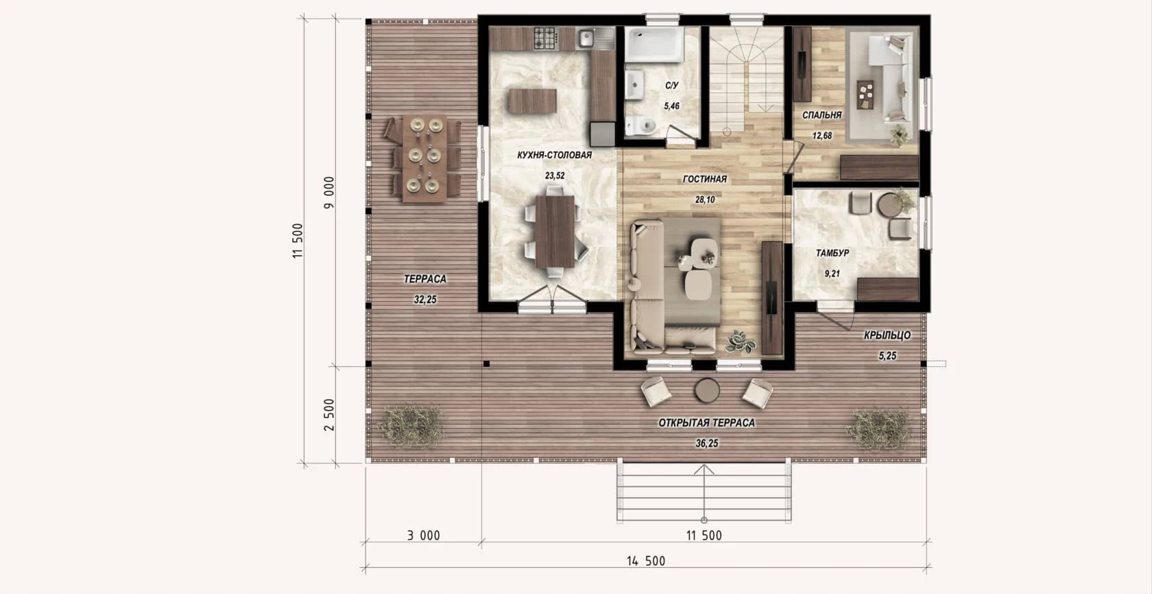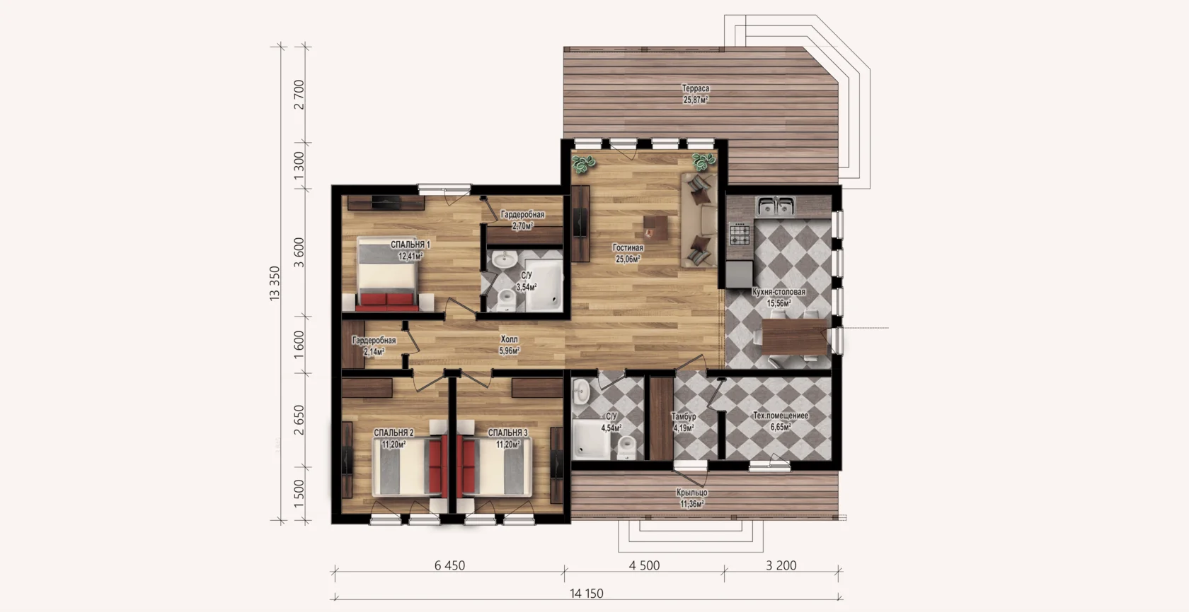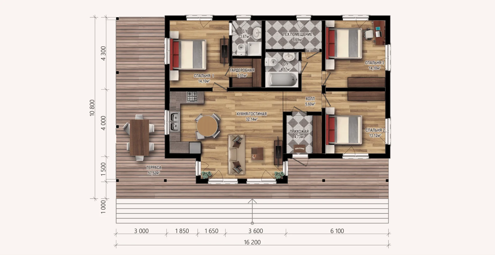Стильный одноэтажный дом, площадью 117 м² и размерами 16,2×10,8 м, идеально подходит для проживания небольшой семьи и ценителей комфортной загородной жизни.