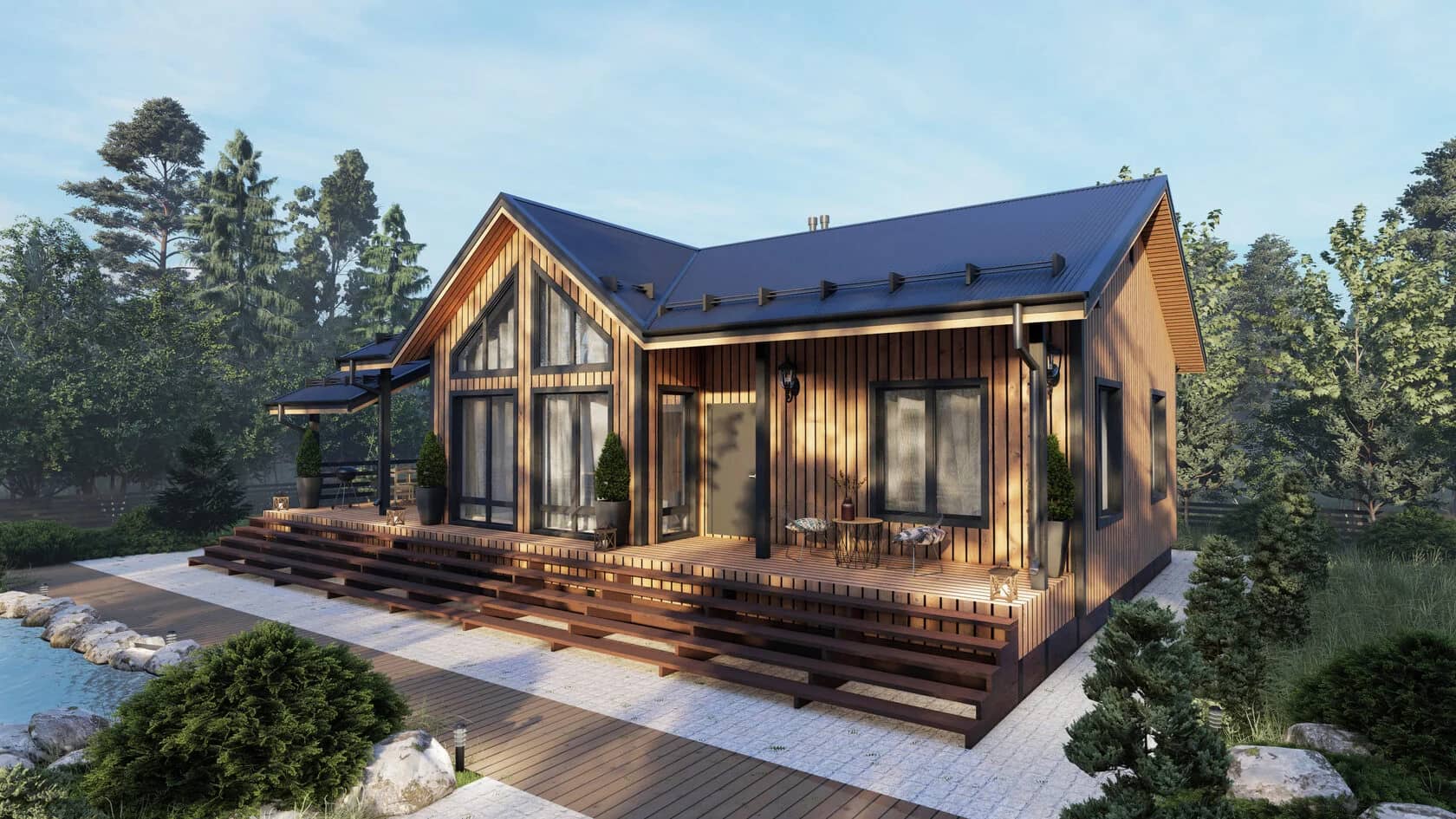 Для отделки использован вертикальный планкен в натуральном оттенке. Темная ламинация окон придает люкс-эффект и завершенность дизайну.